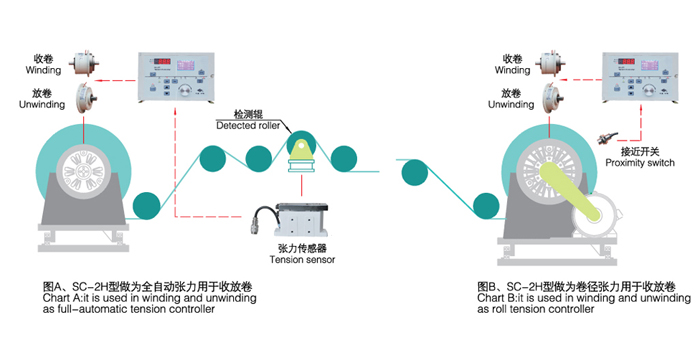 SC-2H型自動(dòng)張力控制儀采用液晶顯示器,可選擇中、英文顯示,界面友好易用,可輸出0-24V/4A直接驅(qū)動(dòng)磁粉離合器、磁粉制動(dòng)器;也可輸出0-5V,0-10V信號(hào),控制變頻器、伺服電機(jī)或其它執(zhí)行機(jī)構(gòu),對(duì)卷繞系統(tǒng)進(jìn)行高精度的張力控制?蓮V泛應(yīng)用于造紙、印刷、包裝、紡織、印染等行業(yè)。