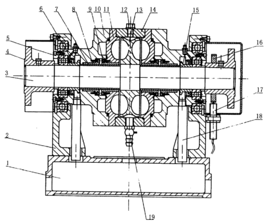 圖三(a)YP1900機(jī)體部件結(jié)構(gòu)示意圖 1、底座 2、左右軸承座 3、主軸部件 4、聯(lián)軸節(jié) 5、軸承壓板 6、骨架油封 7、軸套 8.9、雙金屬軸套 10、左右軸承外殼 11、左右側(cè)殼 12、螺塞 13、轉(zhuǎn)子 14、外殼 15、封水圈 16、測(cè)速齒輪 17、轉(zhuǎn)速傳感器 18、溢水管 19、旋塞
