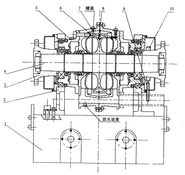 > 圖三(b)YP1900機(jī)體部件結(jié)構(gòu)示意圖 1、底座 2、軸承座 3、聯(lián)軸節(jié) 4、主軸部件 5、軸承殼 6、外殼 7、側(cè)殼 8、轉(zhuǎn)子 9、轉(zhuǎn)速傳感器 10、測(cè)速齒輪