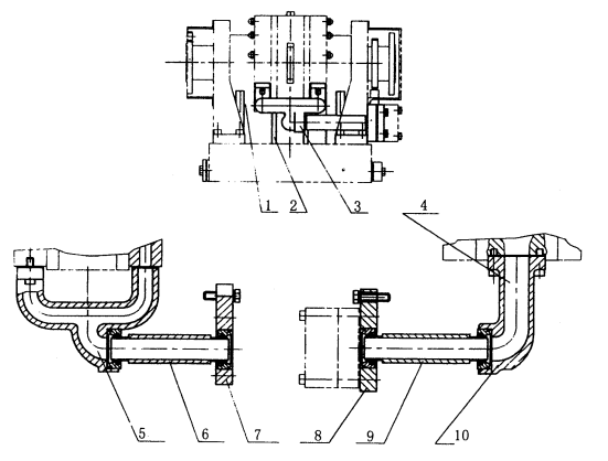 YP60、YP120、YP250、YP380、YP520、YP660型水力測(cè)功機(jī)的進(jìn)水部件由支架、管道、彎管組成,彎管與機(jī)體部件左右軸承外殼連接形成測(cè)功機(jī)的進(jìn)水管路。